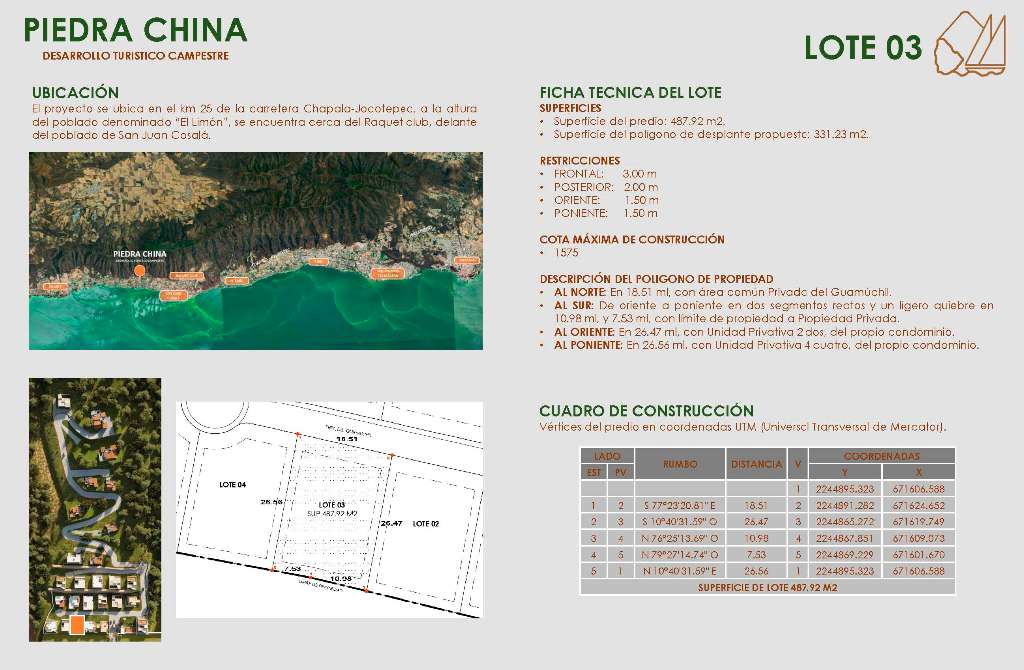 ¡PIEDRA CHINA! 26 Lotes exclusivos con vistas PANORAMICAS al lago de Chapala y al Cerro de García, comunidad segura y tranquila en la parte alta del Fracc. El Limón. Se ubica a 4.2 km del Raquet Club, con la privacidad de un condominio y con los servicios que te ofrece el ubicarte a 375 metros del Pueblo de San Juan Cosala. Caseta de ingreso con vigilancia las 24 horas, areas ajardinadas,vialidades de concreto hidrauldico (18 y 15cm), caminamientos a todo lo largo del desarrollo, Casa Club con area para convivencia, baños completos, cancha de pickleball, juegos infantiles, areas comunes con arbolado.