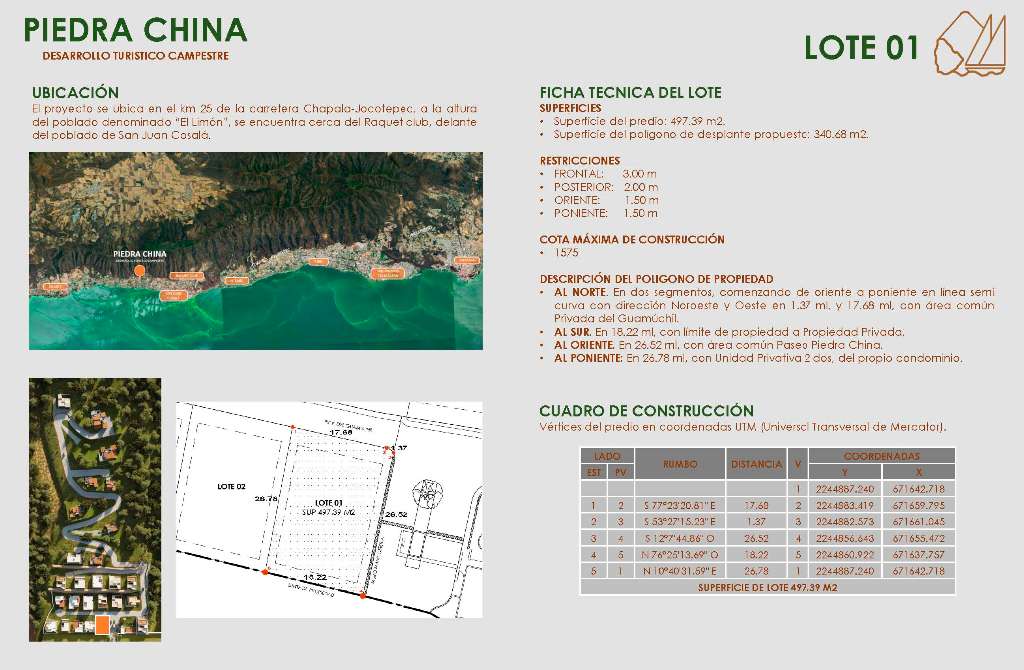 PIEDRA CHINA! 26 exclusive lots with PANORAMIC views of Lake Chapala and Cerro de García, a safe and peaceful community in the upper part of the El Limón subdivision. Located next to the Racquet Club, it offers the privacy of a condominium with the convenience of being just 375 meters from the town of San Juan Cosalá. Features include a gated entrance with 24-hour security, landscaped areas, concrete roads (18 and 15 cm), walkways throughout the development, a clubhouse with a social area, full restrooms, a pickleball court, a children's playground, and wooded common areas. Take advantage of this unique opportunity in a high-value area and invest in your future today! Financing is available for 12 to 24 months.