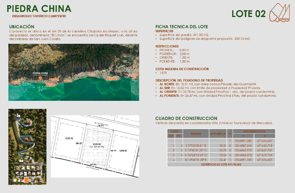 PIEDRA CHINA! 26 exclusive lots with PANORAMIC views of Lake Chapala and Cerro de García, a safe and peaceful community in the upper part of the El Limón subdivision. Located next to the Racquet Club, it offers the privacy of a condominium with the convenience of being just 375 meters from the town of San Juan Cosalá. Features include a gated entrance with 24-hour security, landscaped areas, hydraulic concrete roads (18 and 15 cm), walkways throughout the development, a clubhouse with a social area, full restrooms, a pickleball court, a children's playground, and wooded common areas. Take advantage of this unique opportunity in a high-value area and invest in your future today! Financing is available for 12 to 24 months.