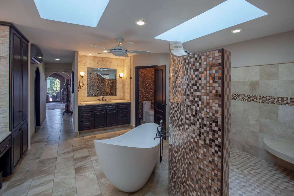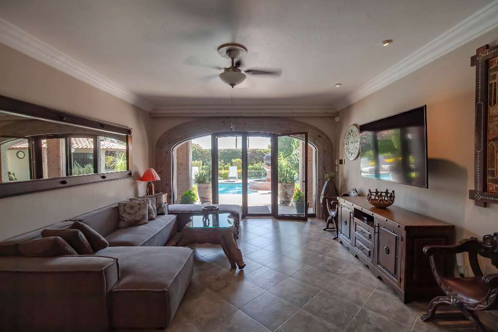 No details overlooked, this home was rebuilt with an extensive use of Cantera stone in the flooring, window and door trim, columns and art niches.