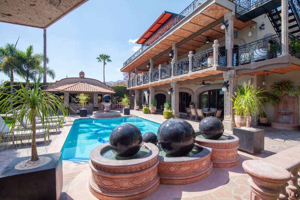 The grounds features a solar heated pool, two covered areas, a fully equipped outdoor kitchen, two water fountains, a water wall feature and a full bath.